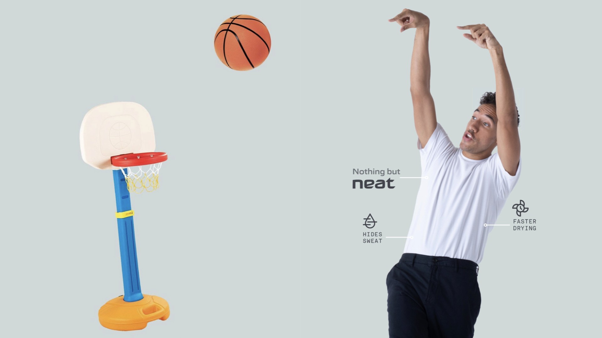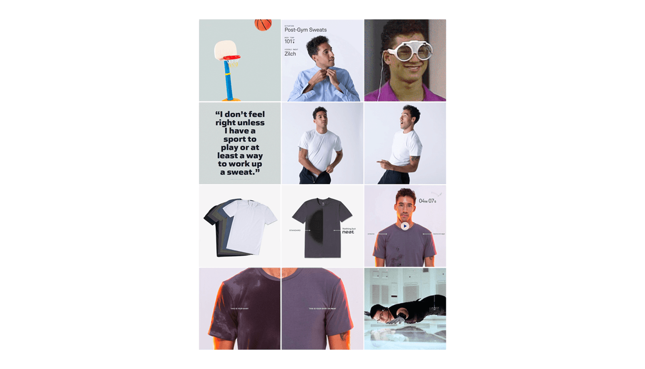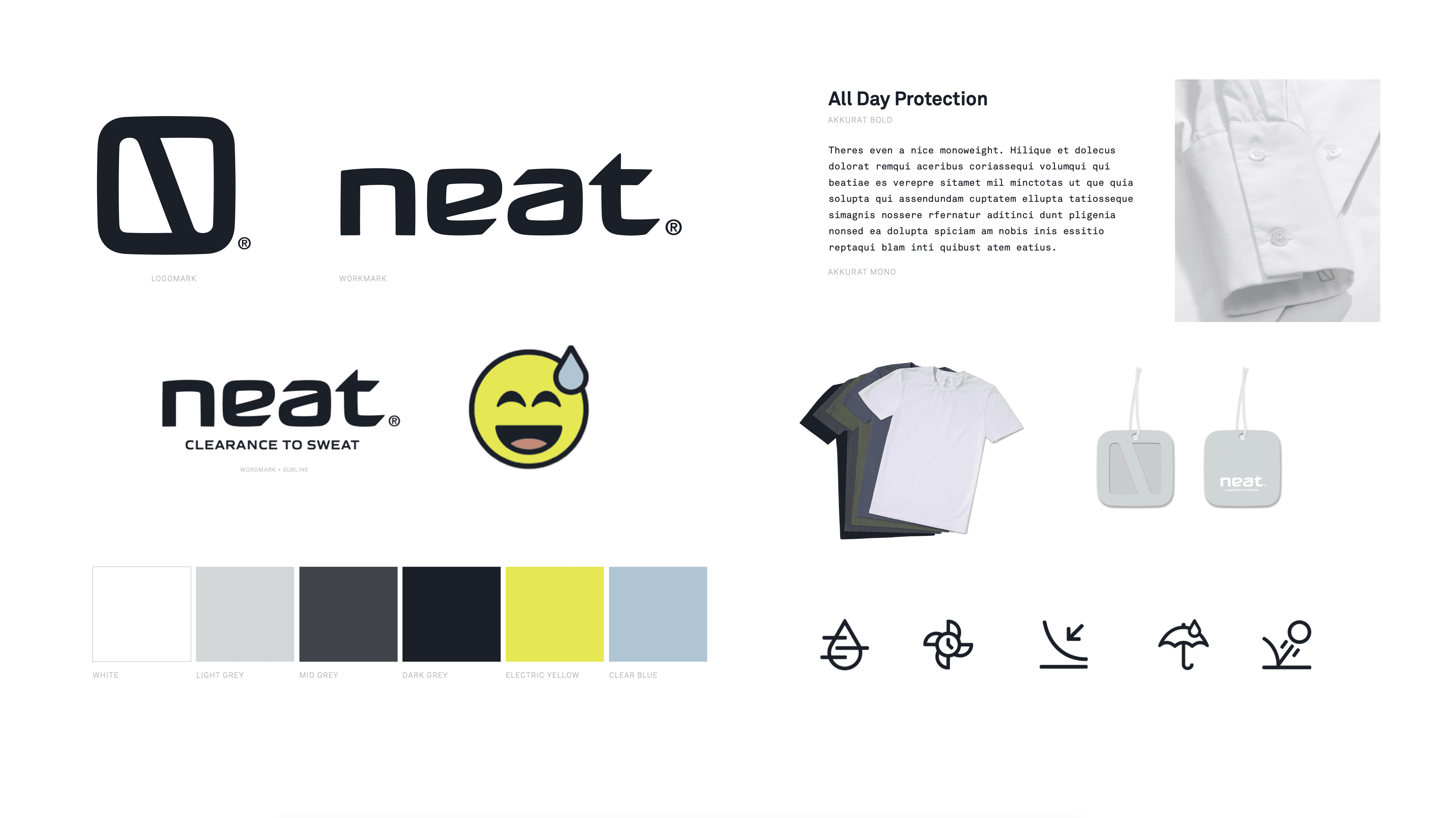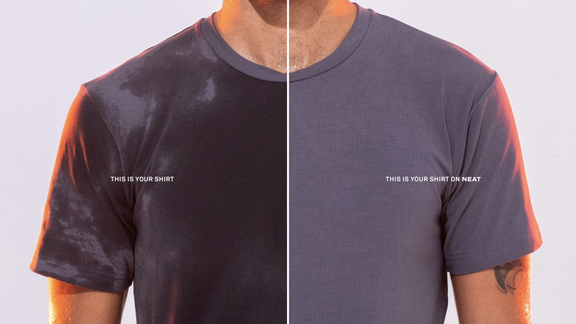 "Nothing but Neat". Storelli had acquired and altered a fabric property that keeps us from looking sweaty from the outside. The brief was take the shame out of sweating and put the onus on our shirts to be better. Our director developed the brand first as a licensed fabric and later as a direct to consumer business. Naming it Neat™ gave it soul, with a soft and encouraging, but noticeably technical aesthetic.